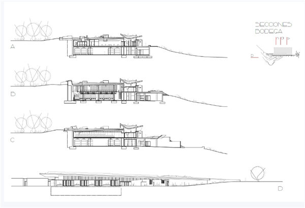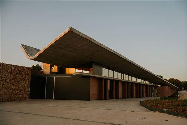 The programme balances an efficient production machine with spaces intended to welcome wine-cultural tourism. A monumental entrance serves both visitors and logistics, while local-stone gabions continue the colour and texture of the site. On the south façade, the envelope alternates glazing and handmade brickwork. The visitor area is conceived as a generous, adaptable social hall, where robust brick mullions deliberately fragment views. I