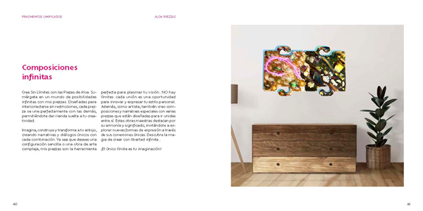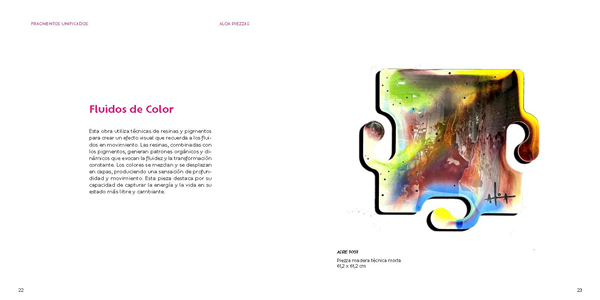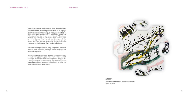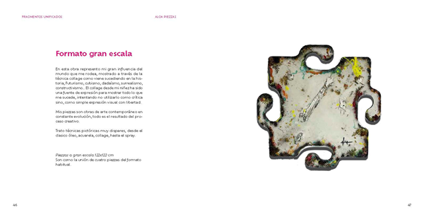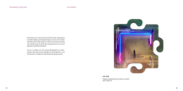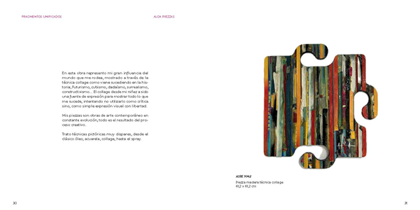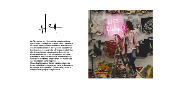"ALOA, nacida en 1990, artista contemporánea apasionada por la pintura desde niña. Licenciada en bellas artes y complementando mi formación con diferentes masters en espacios expositivos, iluminación, escenografía, y trabajando distintas técnicas artísticas en proyectos decorativos. Finalmente decido crear mi proyecto personal, fusionando arte y diseño en un formato único y exclusivo, utilizando y reciclando los materiales que me rodean y me inspiran. Creando piezzas que llenan espacios tanto de forma individual como unidas entre sí. Formando un collage en el que el tú, (espectador) serás el creador de tu propia composición".